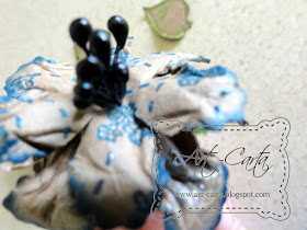 Najpierw"wyprodukowałam" sobie odpowiedni papier. Na kraftowym papierze odbiłam stempel z motywem drobnych kwiatów kolorowymi tuszami: brążowym, niebieskim i czerwonym i zielonym (na listki). Odbitki zembossowałam przezroczystym pudrem.